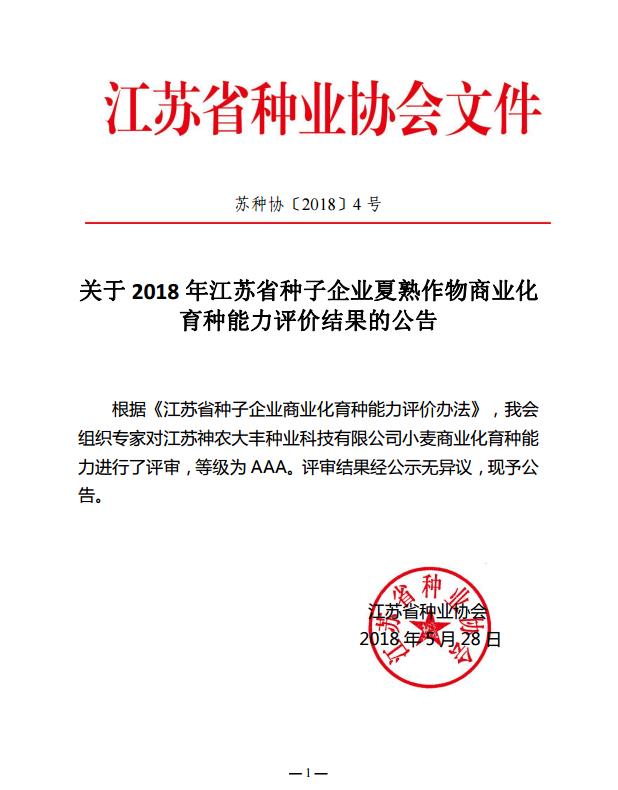 关于2018年江苏省种子企业夏熟作物商业化育种能力评价结果的公告