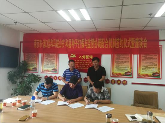 为加大对侵犯品种权和制售假劣种子的打击力度,加强浦口区与相邻的马鞍山市和县两地种子打假监管工作,切实保障农业生产用种安全。近日,浦口区农业局种子管理站、农业行政执法大队与和县种子管理站、农业行政执法大队商讨建立种子打假与监管协调配合机制事宜。签约仪式暨座谈会。