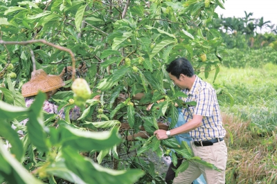7月18日,万宁市农业技术人员前往受灾较重的长丰镇指导农民解决灾后恢复生产难题。 吴鹏摄