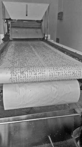 水稻种子被定位印刷播种在纸张上后,用可降解的淀粉胶黏合固定,可边印刷播种边进行纸张卷捆,以便于运输。另外,除了直接铺在稻田里播种,印刷播种好的“稻谷长卷”还可以在大棚育秧或场地育秧的育秧作业流水线上使用,在育秧播种机上先在秧盘里自动装填底层基质,然后摆放纸张、覆盖上层基质、洒水浸泡……