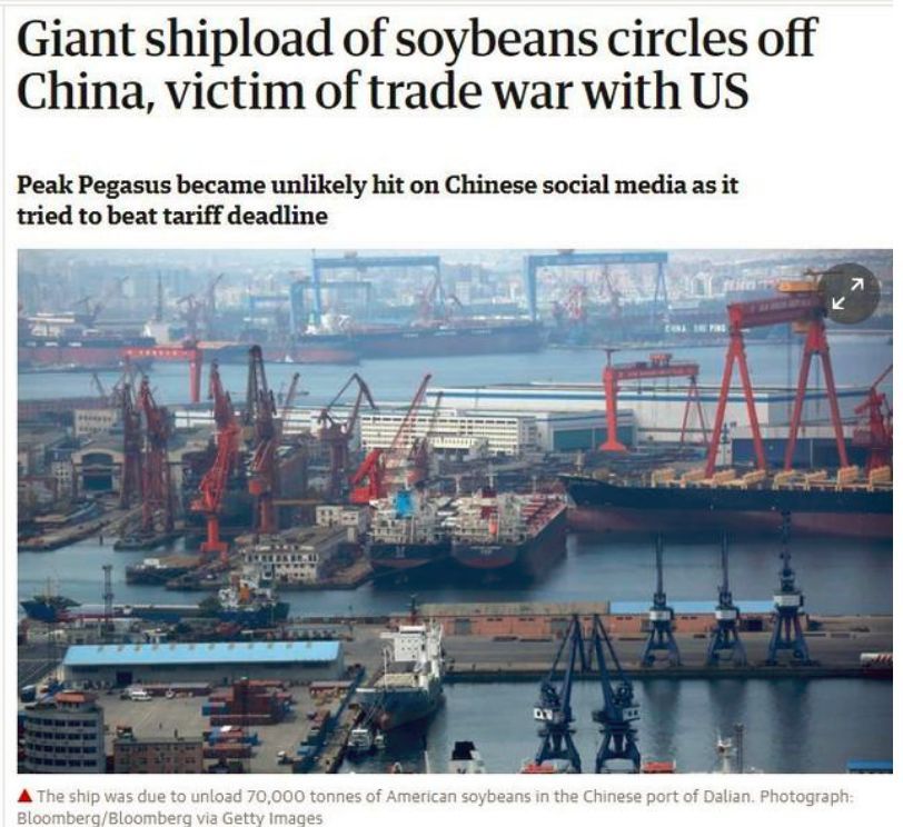 今年7月6日,为反击美国对价值340亿美元的中国商品加征25%的关税,中国宣布对同等规模的美国商品加征关税,而大豆就在这一批加税商品名单中。为了赶在关税落地前抵达大连港,当时这艘“飞马峰”号曾载着7万吨大豆在海上开足马力一路狂奔。英国《卫报》报道称,自“飞马峰”号未能在关税加征落地前抵达中国后,它就一直滞留在海上,在中国境外绕圈航行。报道称,这意味着“飞马峰”号所载的大豆在欧洲和其他地方的潜在买家会要求卖家“打折出售”。此外,把船从中国开到另一个目的地,也必须付出高昂的成本。