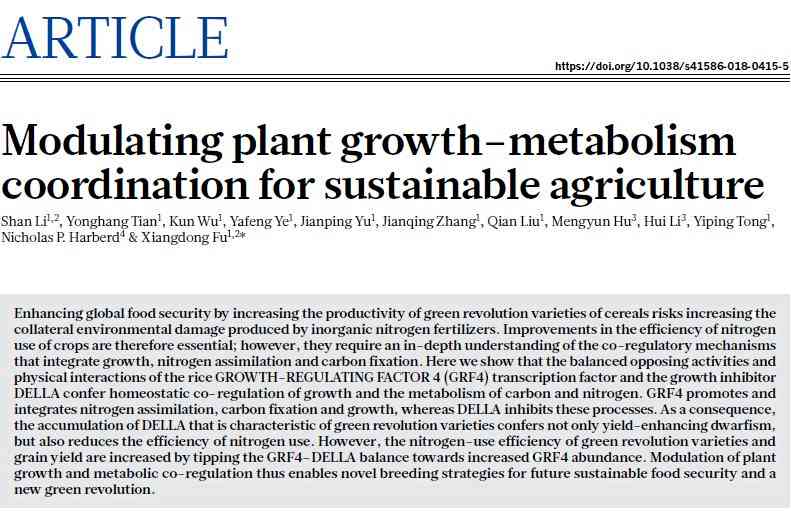 傅向东等人认为,GRF4新功能的发现不仅丰富了对于赤霉素信号传导分子机制的认识,而且从分子水平阐明了“绿色革命”矮杆育种伴随氮肥利用效率低下的原因,并提出了明确的解决方案。