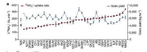 在论文中,研究团队选取了36个籼稻品种。充足的氮肥条件下水培4周测各品种对氮的吸收,同样在高肥条件下土壤种植各品种来采集产量数据。结果显示,36个品种对氮的吸收效率存在最大为3倍的差异。