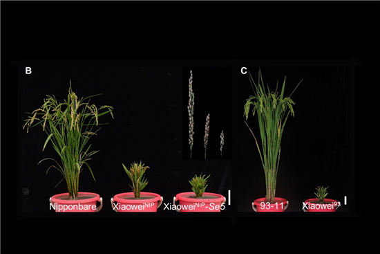 经过十余年的攻关,该团队通过EMS诱变和遗传突变筛选,获得了一种新型的水稻品系“小薇”,该类型品种具有生长周期短、株型和生物量小、空间利用率高等优势,可以像双子叶模式植物拟南芥一样,在实验室内进行大规模的种植和筛选,并且实现表型精确鉴定。通过对“小薇”遗传背景下的节间伸长控制基因和散生基因的克隆,验证了“小薇”的实用性和室内研究体系的可操作性。研究发现,“小薇”的超矮秆表型是由于D18的突变导致。该种突变体除株高显著降低后,其他农艺性状与野生型无显著性差异。