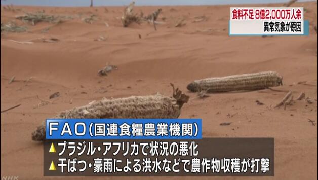 据报道,近3年来,全球面临粮食短缺问题的人口在不断增加,而2017年的数据与10年前持平。从地区分布看,位于南美的巴西和非洲的情况显著恶化。FAO认为,这是因为这些地区遭受的干旱、暴雨等异常天气使得农作物减产。