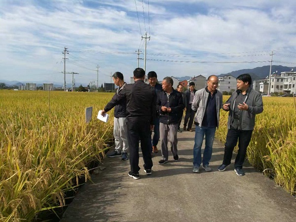 新品种展示示范基地,观摩了位于白鹤镇下余村采用大拢双行种植新技术的甬优12高产示范方和平桥镇上潘村的浙优21高产示范方。