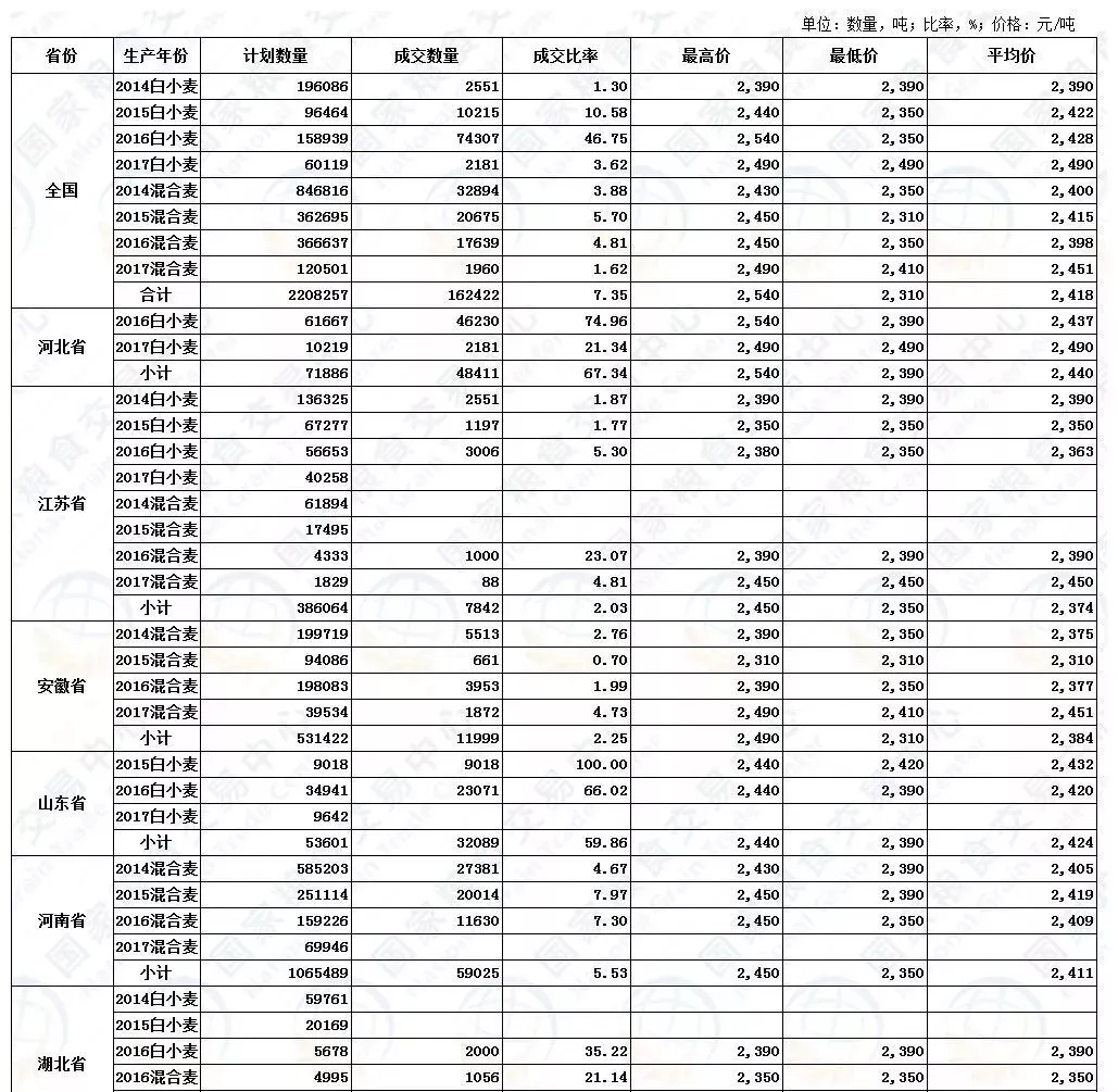 其中首次开拍的2017年小麦计划销售18.06万吨,实际成交0.41万吨,成交率2.29%。国标三等销售底价为2410元/吨,相邻等级价差40元/吨。山东、河南、湖北竟然零成交。