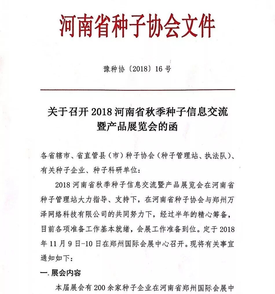 2018河南省秋季种子信息交流暨产品展览会将于11月上旬召开