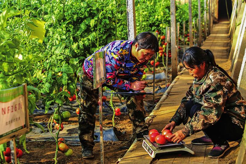 12月18日,在饶阳县蔬菜品种测试基地温室里,种植户在测量西红柿产量。