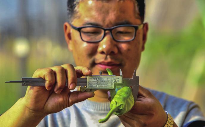 12月18日,在饶阳县蔬菜品种测试基地温室里,技术人员在测量辣椒的直径。