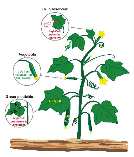 针对黄瓜单产较低和华南类型黄瓜偶有苦味的生产问题,研究人员发现了控制果实数目和苦味形成的关键基因。黄瓜只有雌花才能发育成商品瓜,发现M基因能够控制雌花的形成,M基因是黄瓜首个得到功能确证的重要农艺性状基因,结合该基因作用途径开发了提高雌花率的基因标记,用于辅助选育高产黄瓜。黄瓜中合成葫芦素C导致果实变苦,研究人员发现了控制黄瓜苦味物质合成的9个基因,并发现有两个“开关”基因分别在叶片和果实中控制苦味物质的合成,把果实“开关”关上,不让黄瓜变苦,把叶片“开关”打开,让叶片苦来抗虫。苦味物质精确调控是植物中首次揭示代谢产物的精确调控机制。