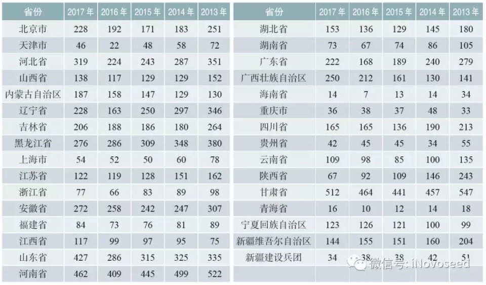 2017 年,有 23 个省(区、市)的种子企业数量出现增长,山东省、河北省、辽宁省分别增加 141 家、95 家和 65 家。有 7 个省(区、市)的种子企业数量减少,数量下降较多省份为陕西省、新疆维吾尔自治区、黑龙江省,分别下降 25 家、11 家、10 家。