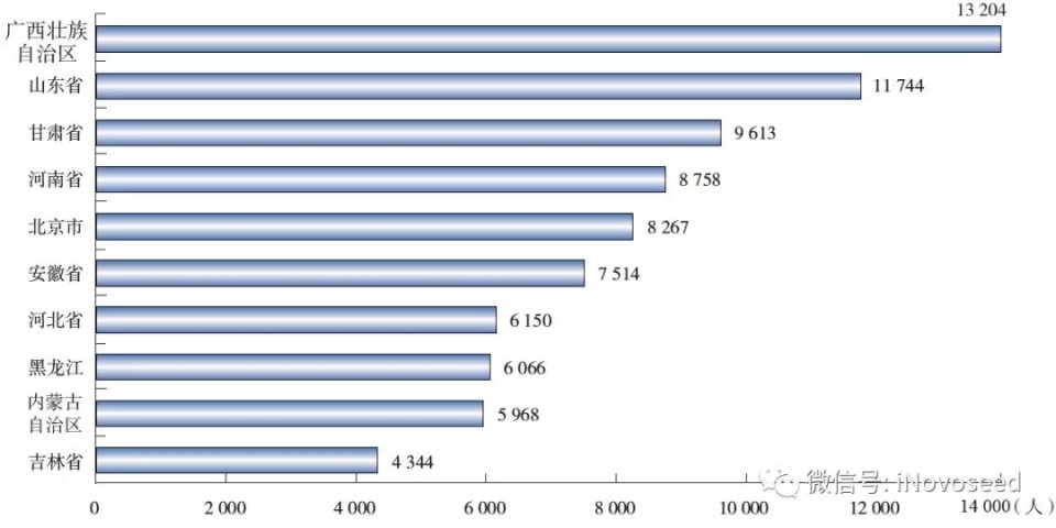 2017 年,全国各省(区、市)共有种子经营企业职工人员 128 055 人。在各省(区、市)种业企业的从业人员中,人数超过万人的省份有广西和山东。而人数不足千人的省份有天津、重庆、海南、青海和贵州。