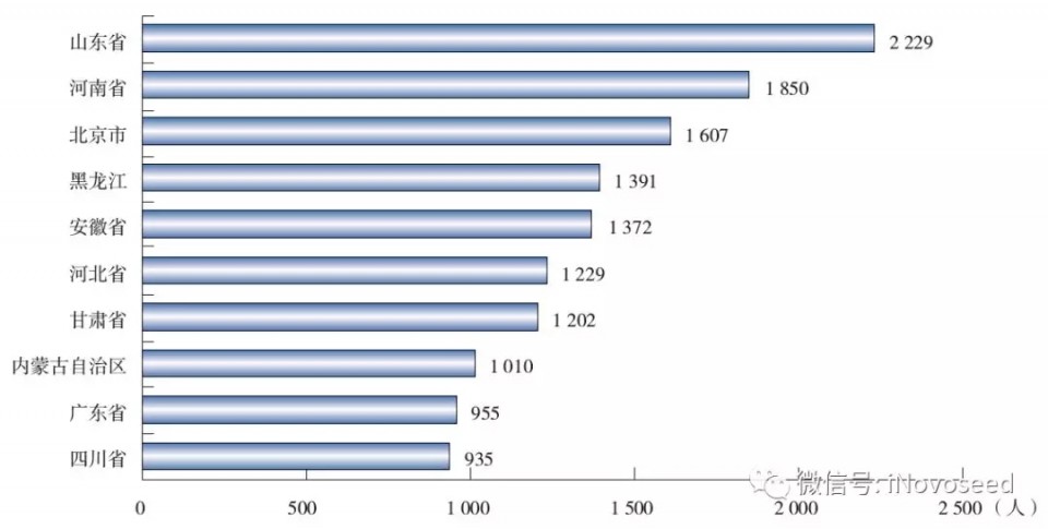 山东省和河南省成为仅有的两个种业企业拥有科研人员数量在 1800 名以上的省份。北京市种业企业的科研人员数量上升为1607 名,排名第三。大部分省(区、市)的科研人员比例依然基本在10%~30%。