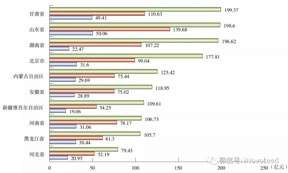 净资产大于1 亿元(含)的215 家种子企业中,北京市有21 家,山东省、甘肃省、内蒙古自治区、湖南省、河南省、新疆维吾尔自治区和湖北省为17 家、16 家、13 家、13 家、11 家、11 家和10 家,八省市的数量超过总数的50%。
