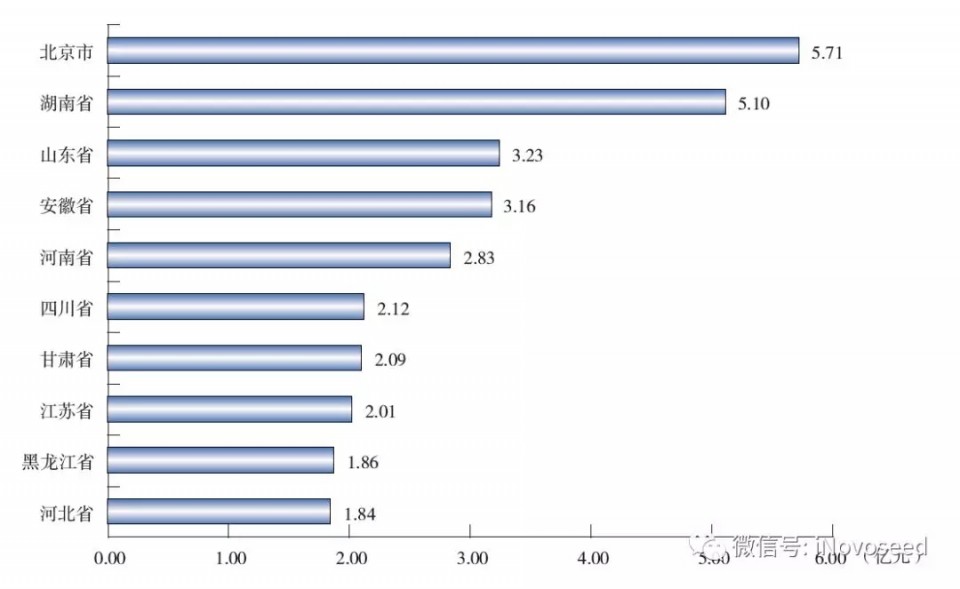 2017 年,北京市种业企业科研投入为5.71 亿元,与2016 年相比下降1.19 亿元,居全国各省(区、市)之首,占到全国种业企业科研总投入的14.43%。企业自主投入力度最大的省份同样是北京市,投入资金5.55 亿元。财政项目投入到企业科研力度最大的省份是湖南,投入资金达到0.85 亿元。