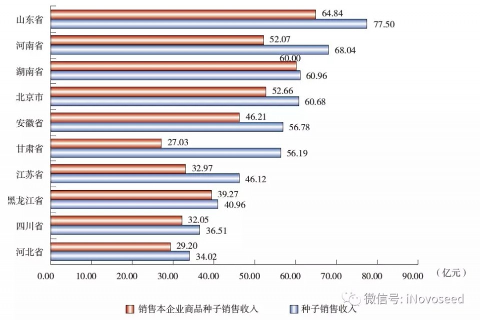 2017 年各地种子企业销售收入比较,山东省种子企业销售种子收入77.50 亿元,其中商品种子销售收入达到73.8 亿元,销售本企业商品种子64.84 亿元,三项指标均居各省(区、市)之首。代制(繁)种子销售收入最高的省份为繁种集中地甘肃省,繁种销售收入达到44.39 亿元。