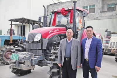 马学杰(右)和父亲马镇顺在国家奖励种粮标兵的“东方红”拖拉机前合影。