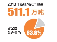 从新疆统计局获悉:2018年新疆棉花产量再创新高,总产量511.1万吨,比2017年增长11.9%,总产量占全国的83.8%。新疆棉花总产、单产、种植面积、商品调拨量连续24年位居全国第一。