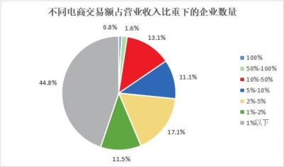经过统计发现,虽然有的企业采用了电子商务的模式,但其所占营业额的比例甚小,此类企业依旧主要采用传统的线下经营方式。近一半企业的电商交易额不足营业额的1%,213家企业是电商交易额不足营业额的10%。电商交易额占营业额比重超过50%的只有6家,其中两家企业为纯互联网交易的企业,电商交易额占营业额比重达到100%。