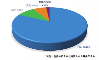 根据课题组调研的819家农业产业化龙头企业数据显示,按照企业所有权性质分类,国有企业占比为9%,民营企业占比为82%,集体经济企业占比为2%,其他企业占比为7%。企业类型为生产加工型企业、农产品专业批发市场、市场流通型企业占比分别为96%、1.7%、2.3%。