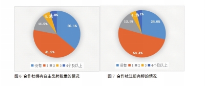 目前,根据观察点体系合作社调查682个有效样本中,已有90.8%的合作社实施了标准化的生产和服务。有63.9%的合作社拥有自主品牌,其中22.0%的合作社能够拥有两个及两个以上的品牌,仍有36.1%的合作社没有自主品牌。有71.1%的合作社注册了商标,有20.7%的合作社能够注册两个及两个以上的商标。具体情况如图(6)和图(7)所示: