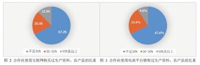 虽然专业合作社在开展农产品电子商务的广度上有所提高,但专业合作社在开展农产品电子商务的深度上仍处于较低水平,即专业合作社使用互联网购买或销售过农产品、生产资料的比重不高。在使用互联网购买过生产资料、农产品的427家合作社中,购买比重不足30%的合作社占到调查总体的67.2%。在使用互联网销售过农产品、生产资料的346家合作社中,销售比重不足30%的合作社占到调查总体的67.6%。具体如图(2)、图(3)所示。