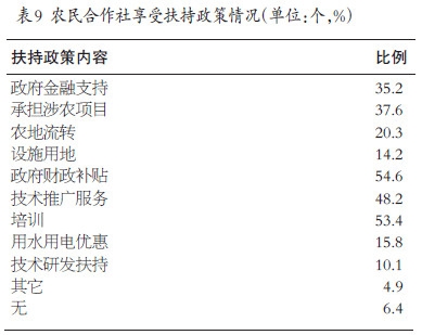 根据全国农村固定观察点调查体系对682个合作社的典型调查,五成及以上的合作社享受到政府财政补贴政策、培训和技术推广服务,分别为54.6%、53.4%和48.2%。近四成的合作社享受到政府金融支持及承担涉农项目扶持政策,占比为35.2%、37.6%,但在农地流转、设施用地、用水用电优惠、技术研发扶持及其他扶持政策享受方面合作社比例较低。