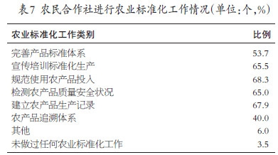 在农产品标准化工作和质量安全方面,农民合作社普遍建立了相关的质量安全控制措施。在对合作社进行农业标准化工作情况统计分析后发现,仅有3.5%的合作社未做过任何农业标准化工作,有83.0%的合作社做过两项及两项以上的农业标准化工作。具体来看,六成以上的合作社均进行了规范使用农产品投入、建立农产品生产记录、宣传培训标准化生产、检测农产品质量安全状况,比例分别为68.3%、67.9%、65.5%和65.0%。完善产品标准体系、农产品追溯体系、和其他标准化工作的比例依次递减,分别为53.7%、40.0%和6.0%,可见农产品追溯体系、质量安全监控方面仍要进一步提高,这也是政策支持可以考虑的方向。