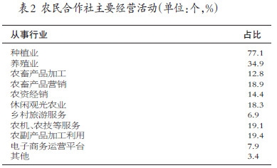 从合作社经营活动类别上看,根据固定观察点体系合作社调查,在682个有效样本中,77.1%的合作社从事种植业,34.9%从事养殖业,从事农畜产品加工、营销占比分别为12.8%、18.9%,还有14.4%的合作社从事农资经销,从事休闲观光农业的合作社占比为18.3%,从事农机、农技等服务、农副产品加工利用的合作社占比相当,分别为19.1%和19.4%,而从事乡村旅游服务、电子商务运营平台及其他经营活动的合作社比例较低。从事的行业为两个或两个以上的合作社占比为60.7%。