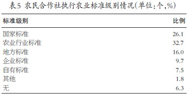 在对合作社在生产经营过程当中执行农业标准级别来看,有26.1%的合作社能够执行国家标准,执行农业行业标准的合作社占比最大,为32.7%,执行地方标准的合作社占比其次,为16.0%,执行企业标准、自有标准和其他标准的合作社占比依次递减,分别为9.7%、7.5%和1.8%,仍有6.3%的合作社未执行任何农业标准。