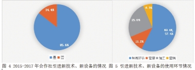 近两年来,八成以上的合作社引进新技术、新设备,分别用于种养环节、管理、加工和营销环节。分析引进新技术、新设备的使用环节情况,在584个引进新技术、新设备的合作社中,近六成合作社将新技术、新设备用于种养环节上,在加工、管理、营销方面依次递减,分别为26.4%、11.8%和6.7%。