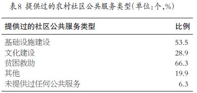 在提供农村社区公共服务方面,合作社积极参与基础设施建设、文化建设并且扶难济困。参与调查的合作社中,有53.5%的合作社提供过农村社区基础设施建设,有28.9%的合作社为农村社区文化建设做出过贡献,有66.3%的合作社为社区内的困难群众提供过帮助。但是,也应当看到,有6.3%的合作社在农村社区公共服务方面投入不足。