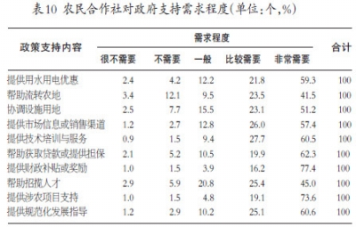 在合作社对政府政策支持需求方面,七成及以上的合作社非常希望在财政补贴或奖励和涉农项目支持上享受到政策支持,占比分别为77.4%、73.6%,六成及以上的合作社表示在用水用电优惠、提供技术培训与服务、帮助获取贷款或提供担保和提供规范化发展指导非常需要,在帮助流转农地、协调设施用地、招揽人才等方面强烈需求程度相对较弱一些,但占比仍达到四成以上。可见合作社在生产、经营过程中十分需要政策支持上的倾斜支持。