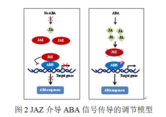 脱落酸(ABA,abscisic acid)被认为是控制种子休眠和萌发的主要植物激素。ABA受体PYR (PYRABACTIN RESISTANCE)/PYL (PYR1-LIKE)/RCAR (REGULATORY COMPonENT OF ABSCISIC ACID RECEPTOR)感知ABA,与PP2C(PROTEIN PHOSPHATASE 2C)形成PYR/RCAR-PP2C复合体并抑制PP2C的活性。PP2C的抑制会释放SnRK2s(SNF1-related kinases 2)以磷酸化下游转录因子并激活ABA响应。其中,ABI5(ABSCISIC ACID INSENSITIVE5,ABA信号传导中的主要转录因子)与靶基因启动子的ABRE(ABA响应元件)结合,调节靶基因表达并最终抑制种子萌发。除ABA之外,茉莉素(Jasmonate,JA)在调节植物发育和环境反应的各个方面也起着重要作用。在拟南芥中的研究表明,bHLH(basic helix-loop-helix)转录因子MYC2是JA信号传导途径中的主要调节因子,JAZ(Jasmonate-ZIM domain)蛋白可以与MYC2相互作用以抑制其转录活性,但是JA信号是否参与种子萌发,此前一直不明确。