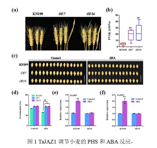 该研究首先在小麦种鉴定了一种与拟南芥JAZ3同源性最高的蛋白并命名为TaJAZ1。研究发现,过表达TaJAZ1 的转基因植株穗中的PVSK(visible sprouted kernels,可见的发芽谷粒)显著高于野生型小麦KN199,但转基因株系对ABA处理抑制种子萌发不敏感,同时,ABA处理明显诱导了野生型种子中TaABI5和TaABF1 的表达,但是这种反应在转基因株系中被消除,显示TaJAZ1是PHS以及小麦种子萌发的正调节因子并且TaJAZ1负调节ABA响应基因的表达。