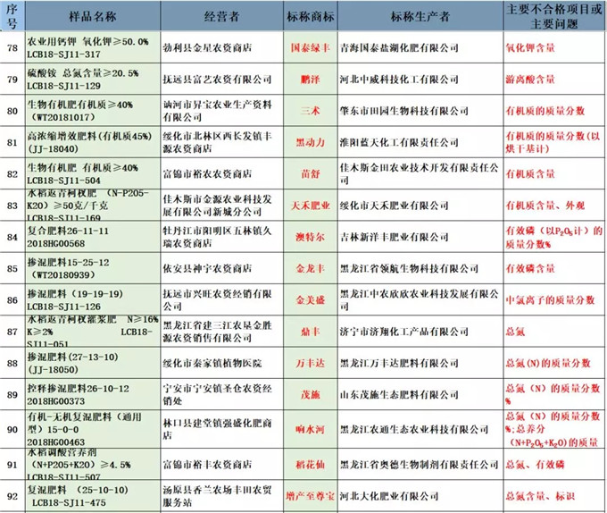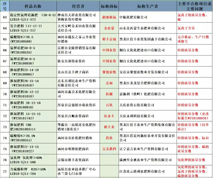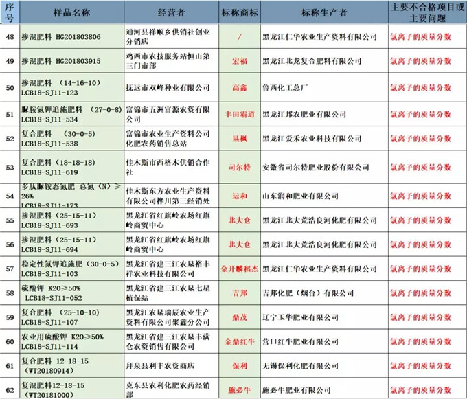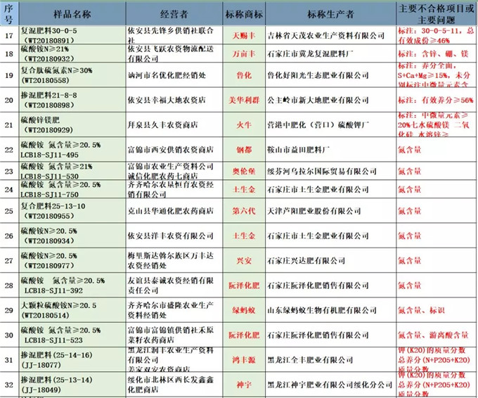 其中,总养分质量不合格的32个批次,氯离子含量有39个不合格,P2O5含量有17个不合格,包装标识不合格的有12个……
