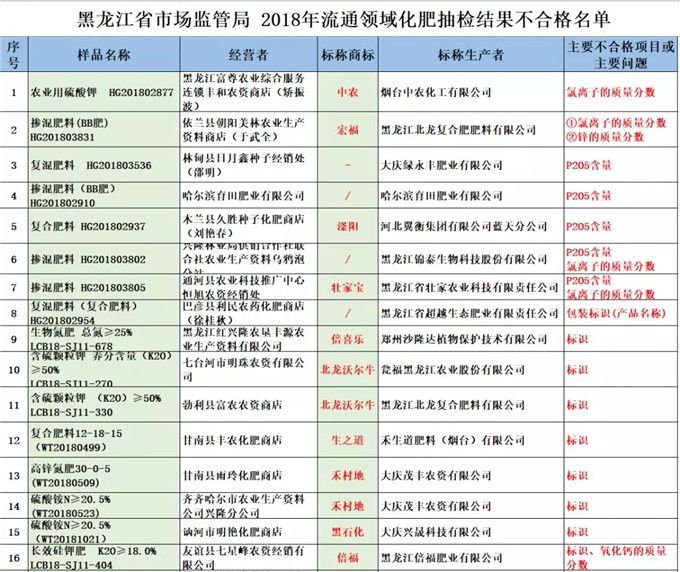 2018年黑龙江质监局组织依据《流通领域商品质量抽查检验办法》、《产品质量法》对氮肥、磷肥、钾肥、复混肥料、掺混肥、有机肥等品种化肥抽检2000批次,不合格122批次;