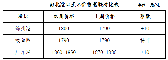本周国内港口玉米价格稳中小幅上涨。由于国储及地方储备影响,东北产区大部分潮粮进入贸易环节,现货价格受政策利好提振上行,但目前东北地区仍处于玉米售粮高峰期,北方港口集港量逐步增多,加上非洲猪瘟影响饲企效益下降,导致北粮南运贸易需求疲软,港口走货缓慢,库存压力增大,港口收购价格上涨动力不足;而南方港口库存压力高企,港口走货速度加快,叠加北方玉米价格上涨,支撑贸易商报价心态偏强,但玉米现货成交清淡,抑制港口收购价上行空间。