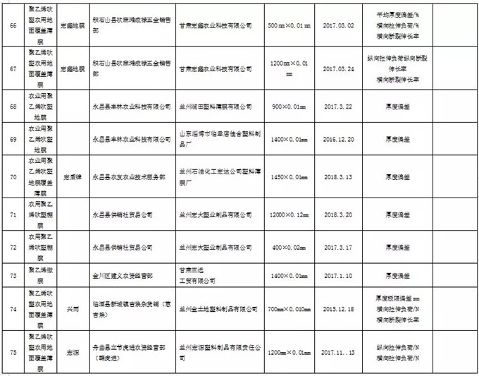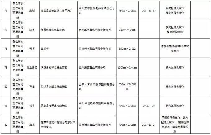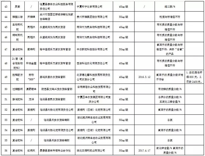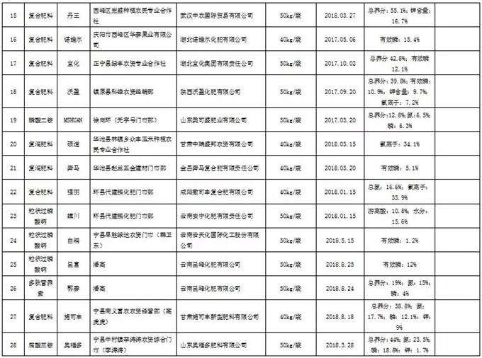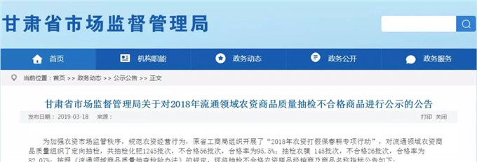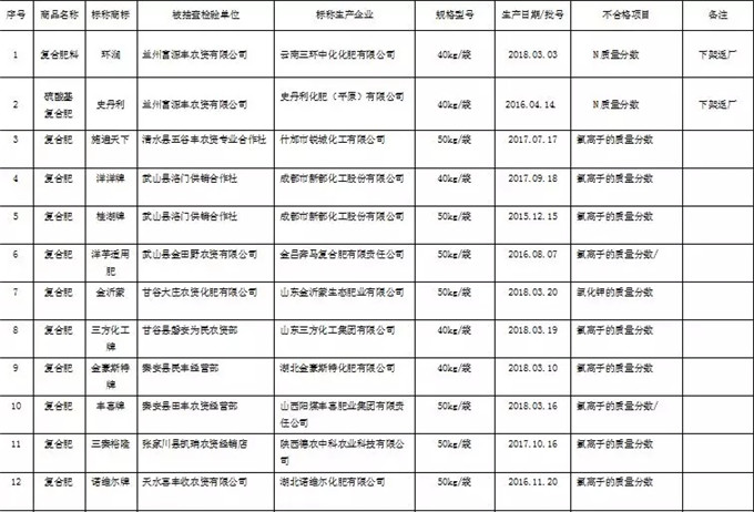 为加强农资市场监管秩序,规范农资经营行为,原省工商局组织开展了“2018年农资打假保春耕专项行动”,对流通领域农资商品质量组织了定向抽检,共抽检化肥1245批次,不合格56批次,合格率为95.5%;抽检农膜 145批次,不合格26批次,合格率为82.07%;按照《流通领域商品质量抽查检验办法》的规定,现将抽检不合格农资样品经销商及商品名称指标公告如下: