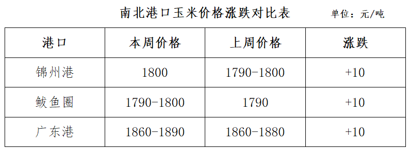 本周国内港口玉米价格延续上涨。北方港口受东北粮价趋强影响,新粮集港成本增加,集港量有所减少,但玉米库存压力仍较大,贸易商收购意愿差,价格上涨相对迟缓;南方港口由于东北地区玉米上量不断增加,库存水平继续上升,而受非洲猪瘟疫情持续影响,饲企采购仍以刚需补库为主,现货采购随用随买,但到货成本支撑,同时外贸玉米到货供给制约市场价格,市场供需短期平衡,局部地区价格略有涨幅。