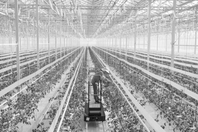 图为园区工作人员在乘坐自动升降机对番茄苗进行日常护理。