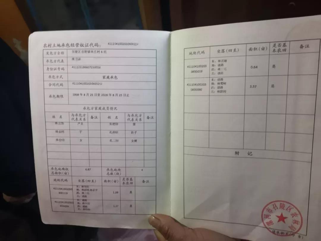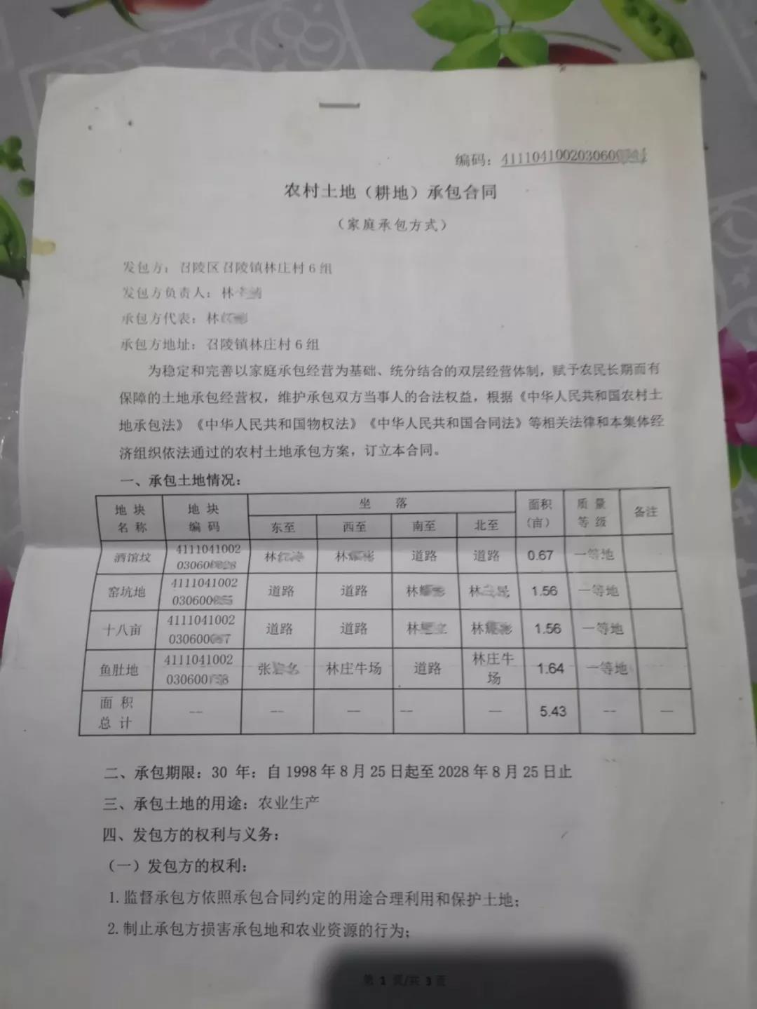 在林庄村,记者见到了村民提供的2016年由漯河市召陵区人民政府颁发的农村土地承包经营权证,以及农村土地承包合同,上面写着承包期限30年,自1998年8月25日至2028年8月25日;承包土地用途是用于农业生产。“这次推的麦田都是一等地,对村里来说,都是好地,是村民耕种的基本农田。”林红彬说。