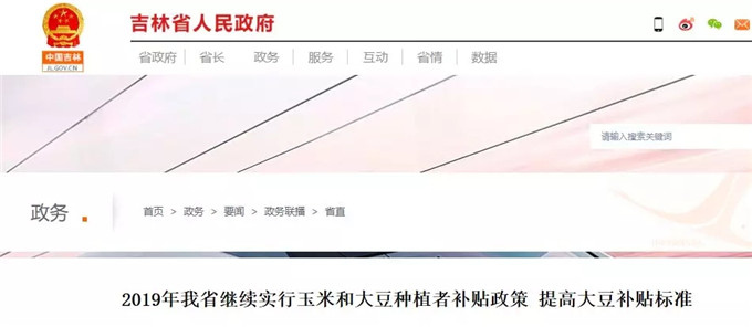 近日,吉林省财政厅、省发改委和省农业农村厅联合下发《关于2019玉米和大豆生产者补贴有关事项的通知》。《通知》指出,2019年,我省继续对市县给予补贴,玉米生产者补贴水平为86元/亩,较2018年下调8元/亩;大豆生产者补贴水平为265元/亩,较2018年提高41元/亩。