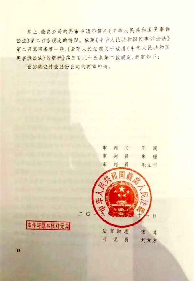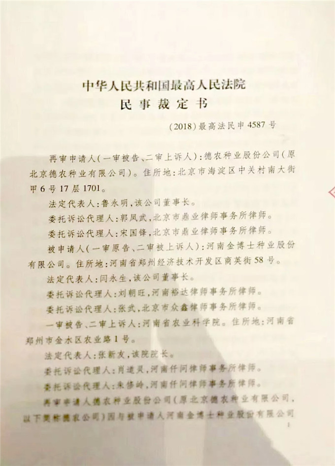 编者按:备受行业关注的郑单58侵权一案,种业商务网曾以《【重磅】判了!河南高院对4950万元植物新品种侵权案做出二审判决!》《【后续】万向德农就子公司德农种业4950万重大诉讼结果发布公告》《【重磅】侵权郑58判赔4950万一案有了新进展:德农种业申请再审,最高院已立案!》等为题,持续关注着本案的最新进展。现如今,根据公开资料显示德农种业股份有限公司(原北京德农种业有限公司)与河南金博士种业股份有限公司侵害植物新品种权纠纷案,最高法民事裁定书“(2018)最高法民申4587号”公布,再审不符合《中华人民共和国民事诉讼法》第二百条规定的情形。依照《中华人民共和国民事诉讼法》第二百零四条第一款,《最高人民法院关于适用<中华人民共和国民事诉讼法>的解释》第三百九十五条第二款规定,裁定如下:驳回德农种业股份公司的再审申请!