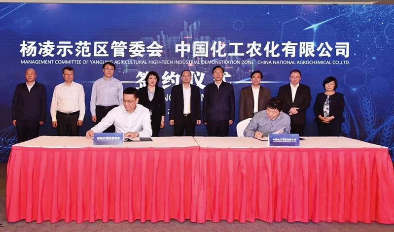 陕西省政府副省长、杨凌示范区管委会主任魏增军,中国化工集团有限公司总经理杨兴强出席仪式,杨凌示范区党工委书记李婧主持签约仪式。中国化工农化有限公司党委书记、董事长陈洪波与杨凌示范区党工委副书记、管委会常务副主任李九红共同签订先正达种业育种技术中心项目协议。