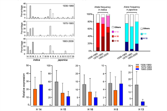 研究人员选取了123个从1936年到2009年育成的中国主栽大面积推广品种,以分析Hd1单倍型与产量相关性状的人工选择。在这些品种中,粳稻主要有2种单倍型(H8和H13),而籼稻则有3种主要单倍型(H14、H15和H16)。等位基因频率分析结果表明,Hd1基因在中国主栽的籼稻品种和粳稻品种中存在不同优势等位基因差异。早期的籼稻品种以H15为主要单倍型,近年育成的品种则以H16和H14为主要单倍型;而粳稻Hd1的单倍型始终以H8为主要单倍型。进一步分析表明,籼型Hd1优势等位基因型H16是现代大穗型水稻育种的优势单倍型,其在二次枝梗数上有着明显的人工选择趋向。通过分子设计将籼稻H16单倍型导入粳稻品种春江06,在适当延长粳稻抽穗期的同时,显著提高了粳稻春江06在海南种植的单穗产量(约增加19.7%),又保证了其粳稻原有的蒸煮食味品质特性。