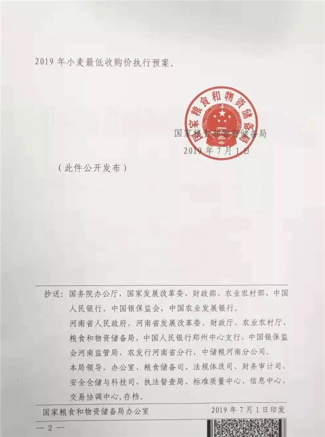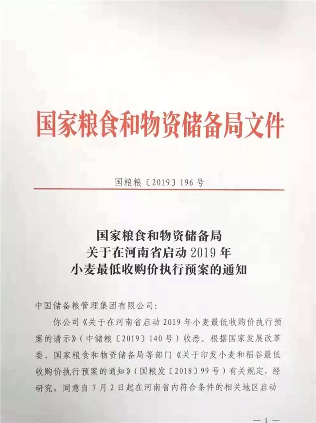 根据国家发展改革委、国家粮食和物资储备局等部门《关于印发小麦和稻谷最低收购价执行预案的通知》(国粮发〔2018〕99号)有关规定,经研究,同意自7月2日起在河南省内符合条件的相关地区启动2019年小麦最低收购价执行预案。
