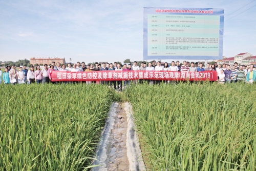 当天上午,益阳市资阳区新桥镇的100亩水稻示范田里,集中展示了新型生物有机肥和绿肥覆盖防控杂草、纸膜覆盖防除杂草、抛秧田水控免化学除草、农艺与除草剂结合减量增效、多靶标协同防控抗药性杂草、机直播播喷同步除草等10个专题示范区,19家企业60个新药剂和新技术参与试验示范,可谓是最新稻田杂草防除技术的大比武、大集成。