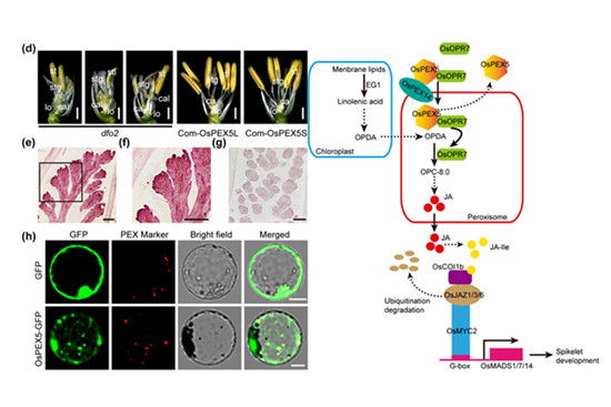 该团队以水稻小穗发育畸形突变体为材料,通过图位克隆的方法鉴定了一个编码过氧化物酶体受体蛋白基因OsPEX5。OsPEX5蛋白可以与茉莉酸生物合成途径的12-氧-植物二烯酸还原酶发生互作并影响其过氧化物酶体定位,造成突变体中茉莉酸含量下降,且通过外源甲基茉莉酸处理可以部分恢复其小穗异常的表型。进一步研究还发现,水稻茉莉酸信号途径中的正向调控因子可以结合到花发育关键基因的启动子上并激活它们的表达,并且这种激活作用会被茉莉酸信号途径中的负调控因子所拮抗。该研究完善了茉莉酸调节植物生殖发育的分子机制,并为调控植物中茉莉酸的生物合成提供了重要的理论基础。